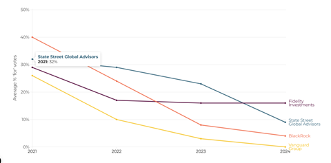 Data published by ShareAction in February shows a steep drop in State Street’s support for environmental and social resolutions at annual meetings between 2023 and 2024 (see table).